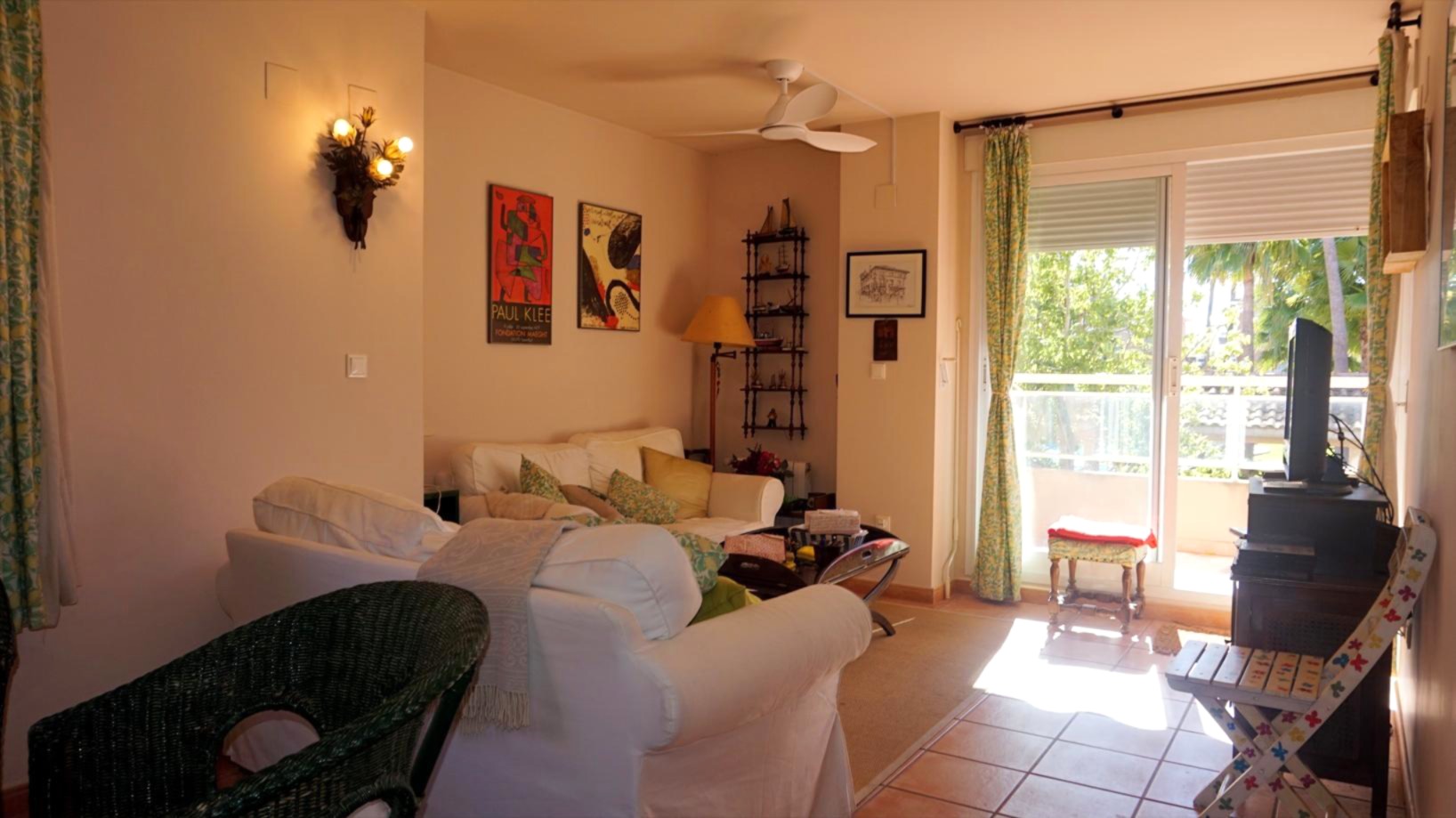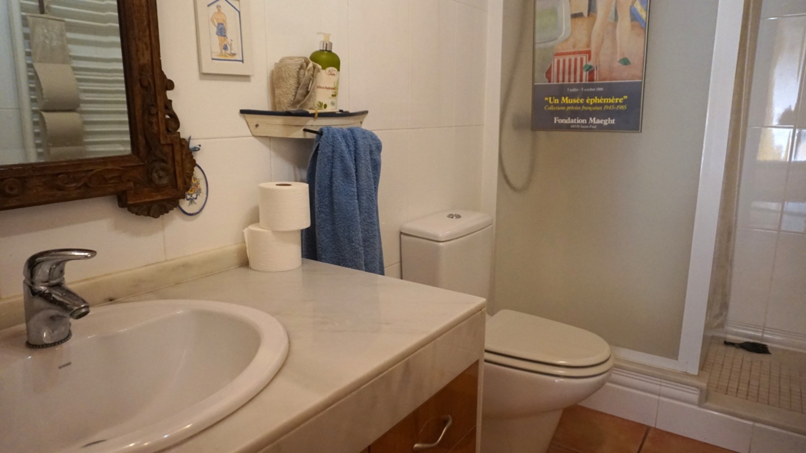 Confort et Prestations : L'appartement comprend un hall d'entrée avec de grands placards, une cuisine indépendante équipée et deux chambres doubles. La suite parentale bénéficie d'un accès direct à la terrasse et d'une salle de bain privative. Le confort est assuré par un chauffage au gaz, du double vitrage et de beaux sols en terre cuite.